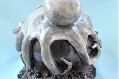 Le opere del laboratorio ceramica sono frutto della sintesi tra disegni idee e bozzetti di entrambi , realizzate con la tecnica Raku che prevede una doppia cottura, una prima in un forno elettrico per ceramica a temperature elevate e una seconda in un forno a gas con una cottura veloce a fuoco vivo. Dopo la cottura, i pezzi vengono rapidamente raffreddati, causando il craquelé superficiale e l’annerimento delle parti non smaltate a causa del fumo sprigionato durante il processo. Di solito le opere realizzate con questa tecnica sono sculture di dimensioni medie o piccole.